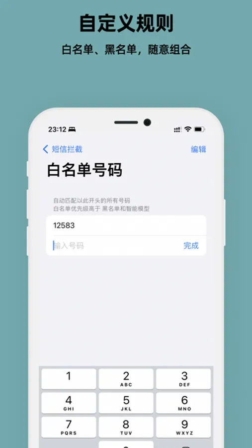 - 黑名单号码号段、白名单关键词。优先级次之,匹配后直接拦截,可避免短信轰炸等。