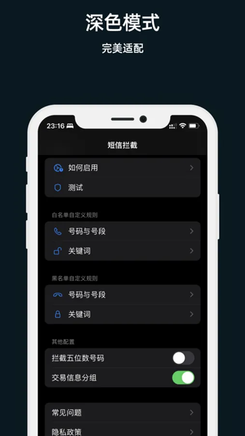 基于 iOS 提供的 信息过滤扩展 来实现短信拦截,独立且无网络化运行。