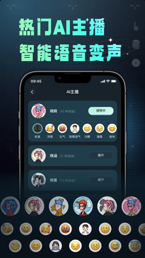 「说话变声」可以实时录音,将录音进行配音变音,涵盖多种声音风格,支持情绪转换,自制语音包更高效