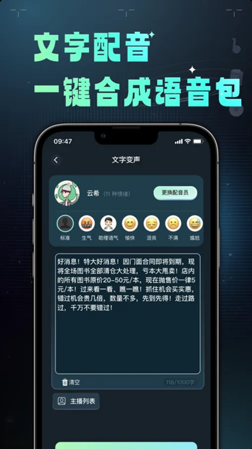 「文字变声」多个AI智能主播音效,输入文字即可帮您合成语音包,也可用于广告促销配音、地摊叫卖录音制作、课件配音、企业宣传配音、超市播报、地铁播报、有声朗读等多种场景