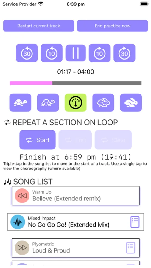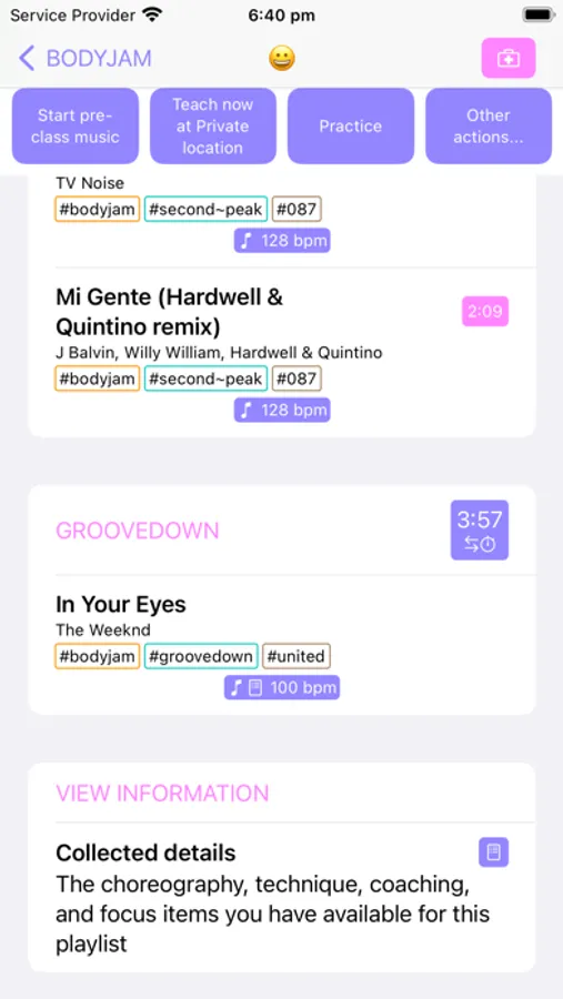 Quickly build new playlists. Add in pauses and alerts that match your classes. Practice with features allowing you to slow down and repeat sections. Teach your class and allow the app to cue the music and let participants know when the next track will be starting. Connect with your participants using app-generated posters you can use on your social media.
