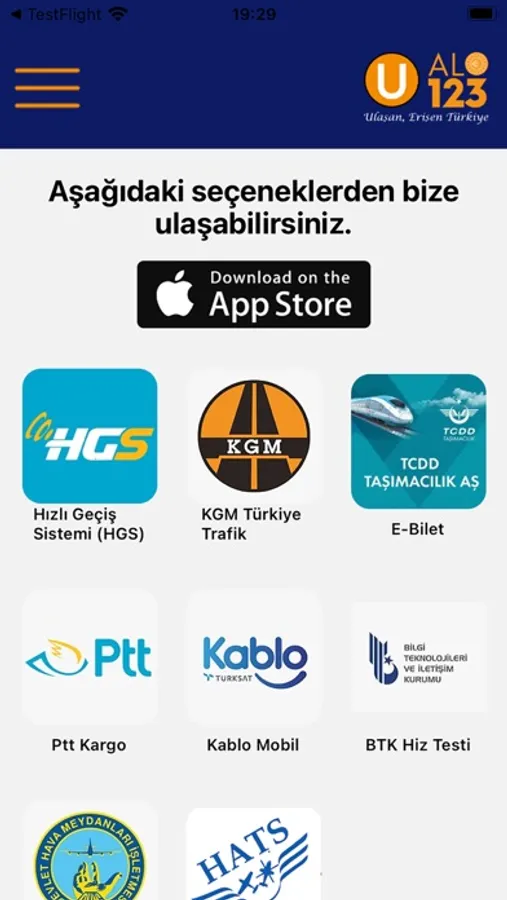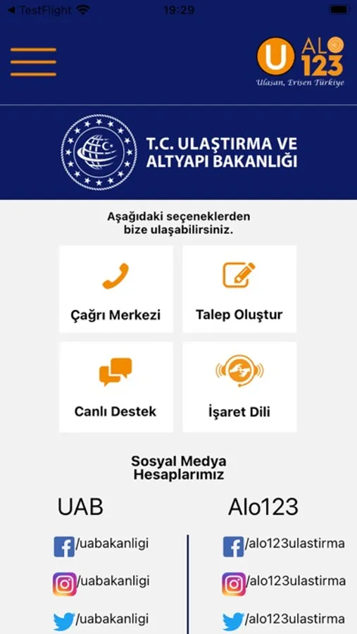 Bize ulaşın sayfamızdan da Ulaştırma ve Altyapı Bakanlığımız ve ALO 123 çağrı merkezine, sosyal medya hesaplarına (Facebook, Instagram ve Twitter) ve Whatsapp hattımıza ulaşabilirsiniz.