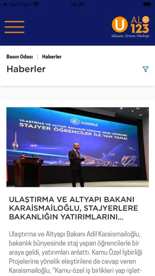 ALO 123, Ulaştırma ve Altyapı Bakanlığının bünyesindeki kurum ve kuruluşların vatandaşlarımıza yönelik hizmetlerini tek çatı altında toplayan erişilebilir ve ulaşılabilir bir mobil uygulamasıdır.