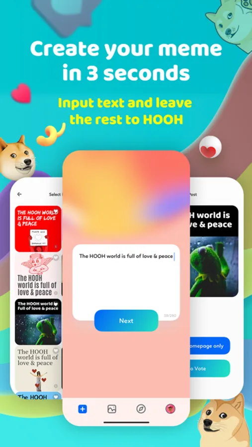 HOOH is a handy tool that helps users easily create their own memes. Users only need to input words, and get suitable image automatically. It could be used to make memes, opinions, or hint fictions, and all could be minted as NFTs and be traded.