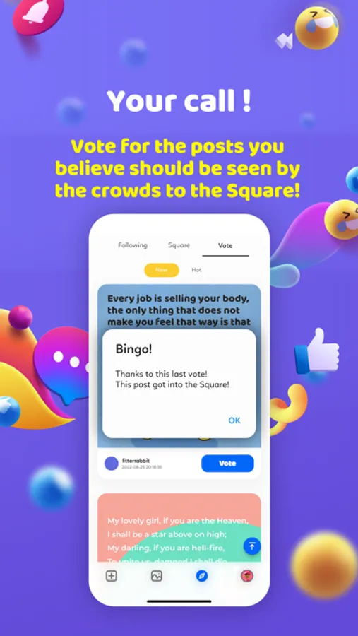 At the same time, your own post will also be voted by others when you send your post to “Vote” area. When votes reach a certain number, this post will go to the “Square” that could be viewed and engaged by the crowds.