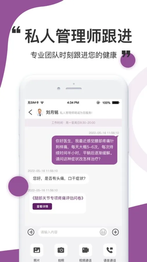 医阡陌运用中医适宜技术以及数字化健康平台,研发、推广、并创新慢性肌骨疼痛诊疗与管理。通过自主研发的智能肌骨疼痛诊断与管理系统,专业的健康管理师及医生团队,以及以用户为中心的产品服务体验,我们为每一位登录平台的用户量身打造线上线下相结合,从居家自疗到实体转诊的全天候智慧医疗解决方案。用户登录APP后,依据自身情况以及自己的疼痛症状和感觉,完成线上疼痛预诊,即可获得疼痛疾病的初步预判和预防、保健、干预、康复方案。线上方案包括如何使用多种能够自我操作、无风险的中医适宜技术和健康产品,并辅以健康管理师提供24小时的使用指导,随时解决用户疑难问题,为有所需要的用户提供更加便捷的疼痛管理。