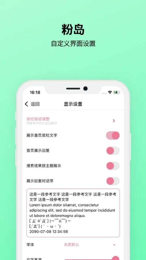 定制显示:字体大小、行距、最大行数、夜间模式、图片位置、图片缩放、串内图片数...