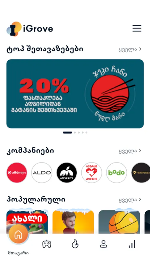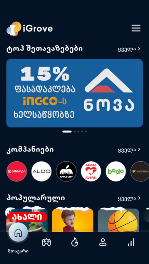 iGrove is a unique, fully Georgian product that allows small, medium, and large businesses to engage in a unique gamification service, and users to get unlimited opportunities to benefit from playing their favorite mobile entertainment games.