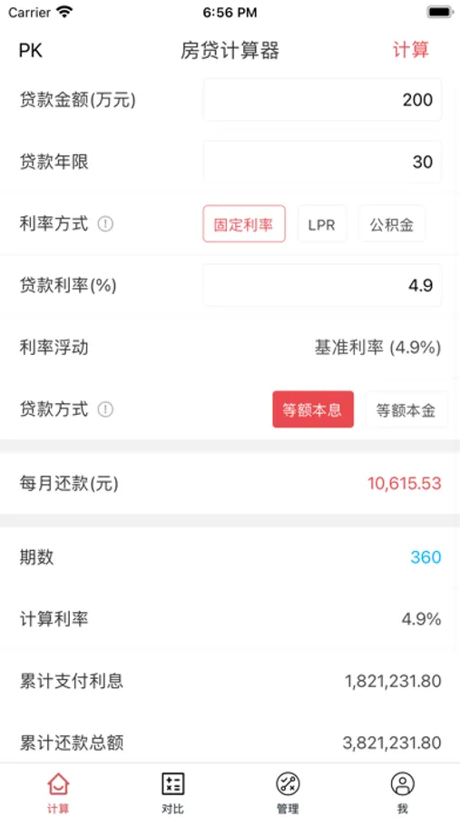 房贷计算:支持 固定利率,LPR,公积金 方式,全面计算出月供,总利息,每月还款等信息。