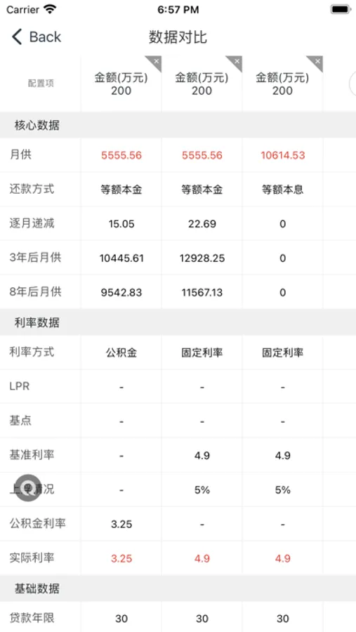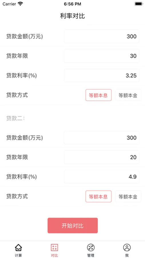 房贷对比:通过房贷计算,可以保存当前的房贷信息,然后选择多个信息做出对比,选择贷款中,最省钱的方式。