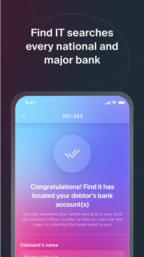 That’s where Find It comes in! We have simplified the search process by performing a main skip trace which is a focus in on the banks. Which from our experience in the Judgment Enforcement industry, is the most successful and promising direction to take resulting in locating ones assets. Along with tracing a bank account, extra information comes with that such as Debtors job information if there is one to provide.