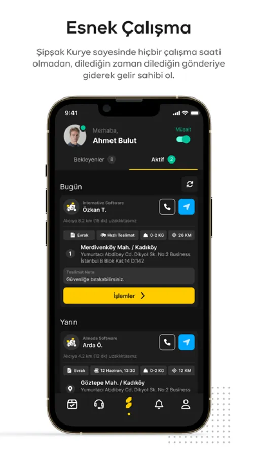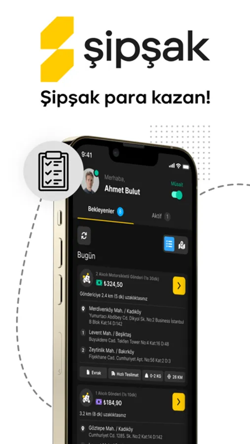 Motosiklet, araç, nakliye... İster kendi aracınla ister Şipşak araçlarıyla kurye olup çalışma saatini kendin belirleyerek gelir/ek gelir sahibi olabilirsin. Üstelik yoldan geçerken bile para kazanabilirsin. Hızlı, anında götürülmesi gereken gönderileri ortak mobil uygulama havuzunda gör, dilediğini kabul et, teslim et ve kazan. Aklına takılan herhangi bir soruda bize info@sipsakapp.com ’dan ulaşabilirsin.