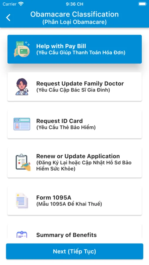 It has various features to help you manage your requests such as primary care changes, request form 1095A, request ID card, update or renew application, request a copy of summary of benefit, and help with any payment services.