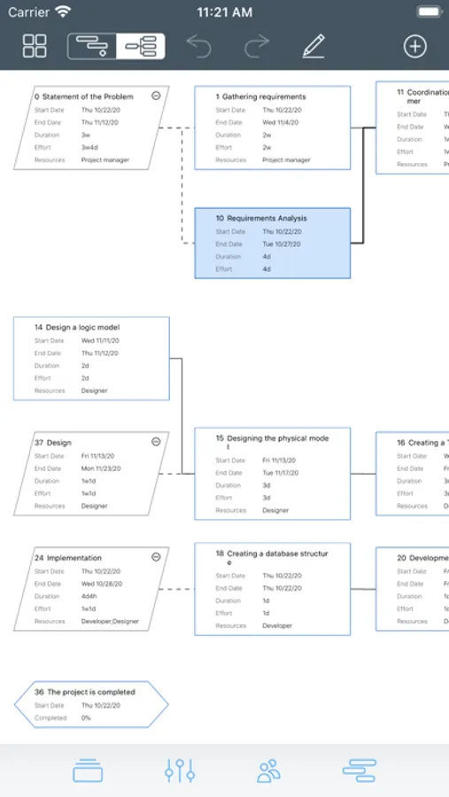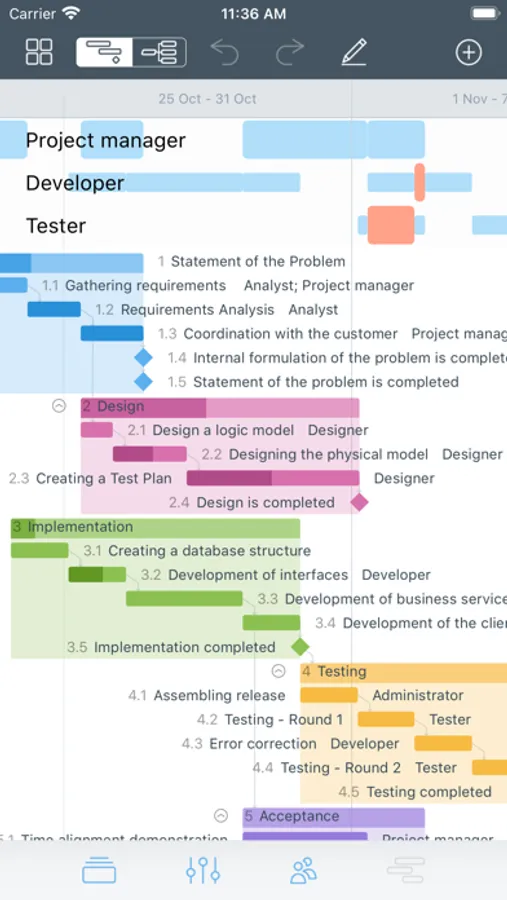 • Resources management: add resources to your project: people or materials, necessary to make this project done. Identify bottlenecks in your project and distribute workloads fairly.