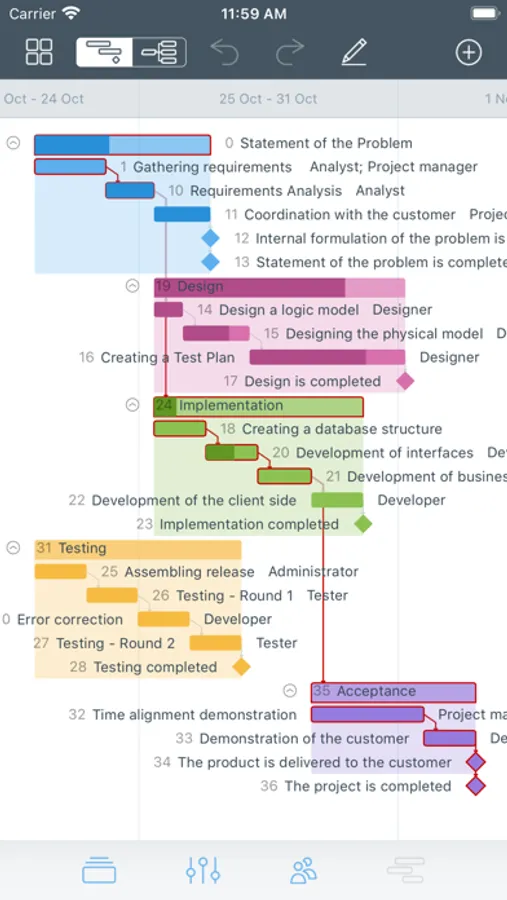 • Outline view: Use the Table view to see your tasks, groups and milestones in a spreadsheet format. Friendly and intuitive interface helps you get things done fast and stays out of your way while doing so.