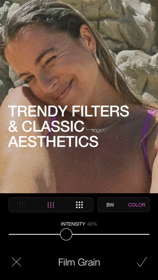 Go beyond the ordinary look of your photos and get that trendy look with the market's best Film grain, our unique Film blur, multi-option Motion Blur, the super trendy Dirty lens effect, Unfocus for an imperfect look, Low Pixels and Chromatic that will give your images a next-level look. It’s all in your hands to create the look you like and show your identity to your followers.