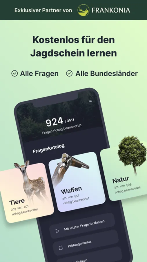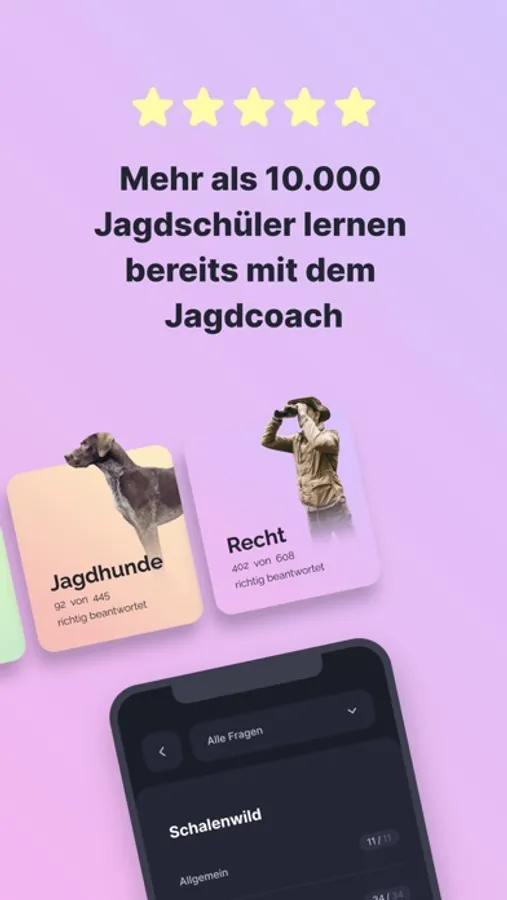 Mit dem Jagdcoach zerteilen wir die vielen Fragen deines Jagdscheins in kleine Kapitel, die du auch zwischendurch hervorragend lernen kannst. Außerdem erklären wir dir alle Tier-Fragen, damit du wirklich was verstehst und nicht nur blind auswendig lernst.