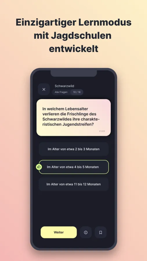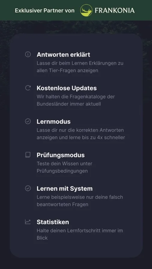Lasse dir beim Lernen für deinen Jagdschein spannende Hintergrundinformationen zu den Tier-Fragen in allen Bundesländern anzeigen.