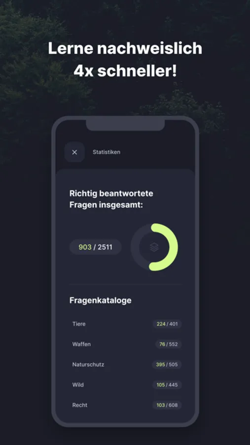• Mit dem Prüfungsmodus erfährst du schnell wo noch Lücken in deinem Lernstand sind und siehst deine Entwicklung in der Historie