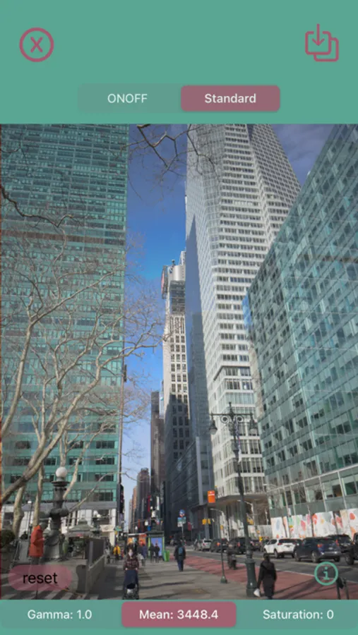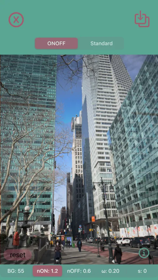 The first method, standard, applies a gamma correction. In this method, you can process the image by adjusting its gamma correction, mean, and saturation. The other method, ONOFF, is our custom method that involves adjusting a weight, alpha value, an off beta value, an on beta value, and a saturation factor. This method is closely related to what our eyes see, and was based on the biological functions of sight.