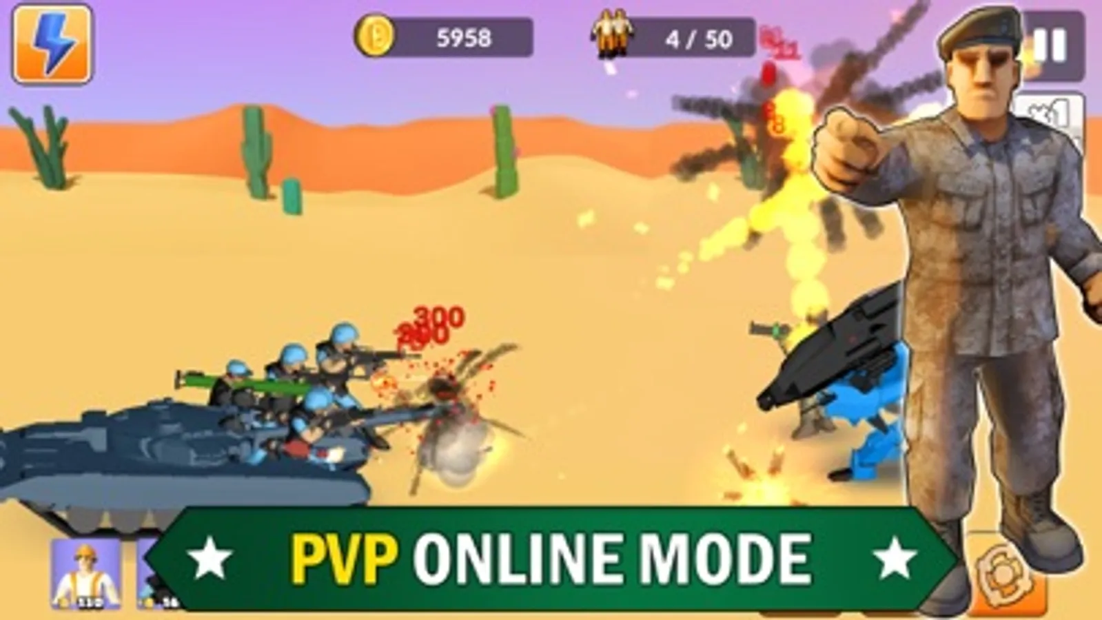 War of Generals game with different battle strategies. Choose one of the available countries and take part in online battles. Assemble your army of infantry, military equipment and popular tanks of the modern years. Take on the challenge on the battlefield! Collect resources to pump up your army or build a fortification.