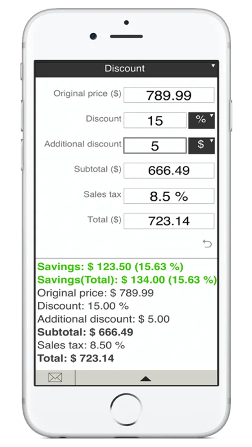 Discount calculations: just enter the original price, discount, sales tax percentage (if applicable) and get the final price and the amount of money you save.You can enter discount percentage or discount amount.