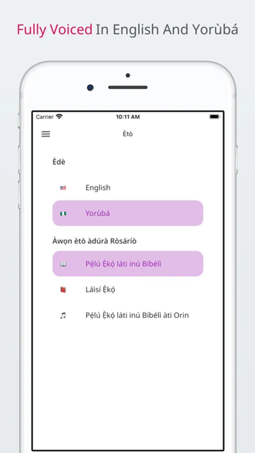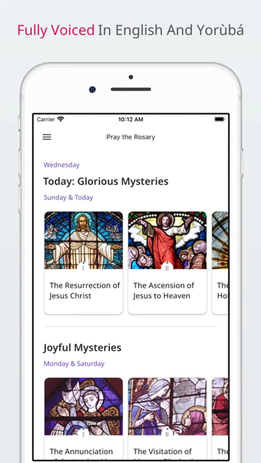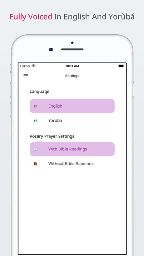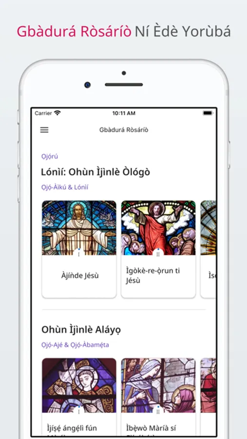 Rosary in Yoruba and English is Catholic rosary app that is fully voiced in Yoruba and English. It contains all 4 mysteries, as well as individual prayers such as Hail Mary, Our Father, O my Jesus, etc. There are additional settings that allow control whether or not there are bible readings after each mystery. If you choose Yoruba as your language, you get access to hymns being played after each mystery or certain prayers.