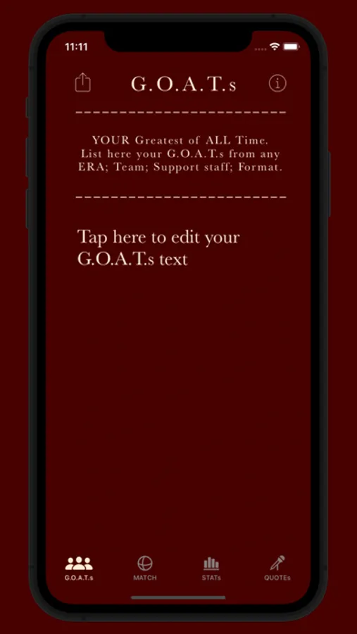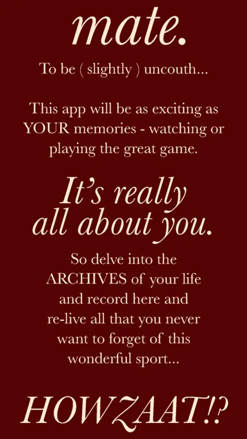 This app is all about you and will be as exciting as YOUR memories - watching or playing the great game. So delve into the archives of your life and record here and re-live all that you never want to forget of this wonderful sport...