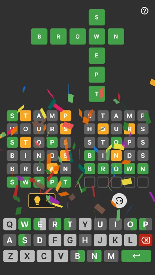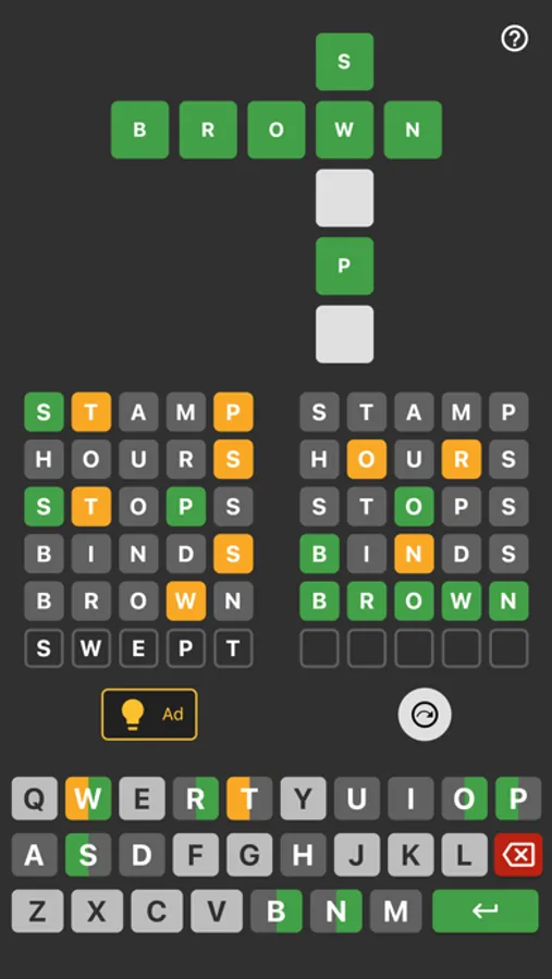 The game includes a crossword tile that displays hints by showing the correct letters as green. You can also use the hint option to reveal correct letters one by one. But be careful, because each hint you use will reduce your final score.