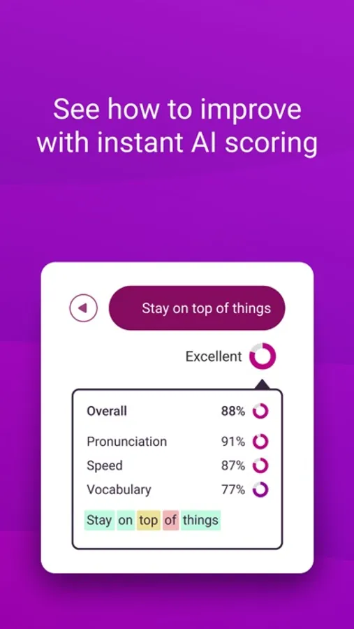 Develop a natural-sounding speaking style by mastering everyday expressions and using them in conversation scenarios. Practice as much as you like without any fear of embarrassment. Receive instant scoring feedback by using our AI-powered scoring technology. Start thinking in English by doing a 3 - 5 minute lesson each day.