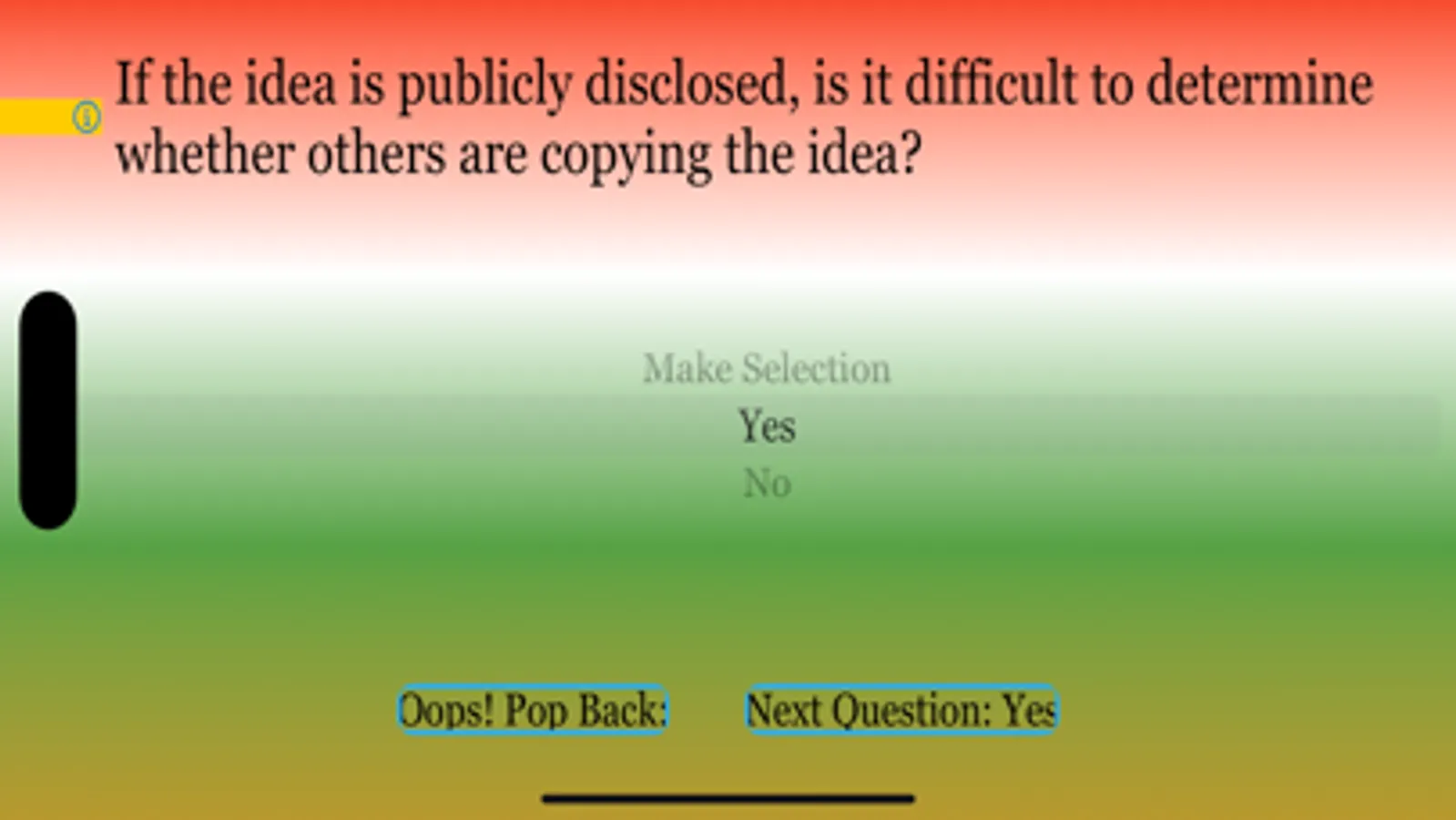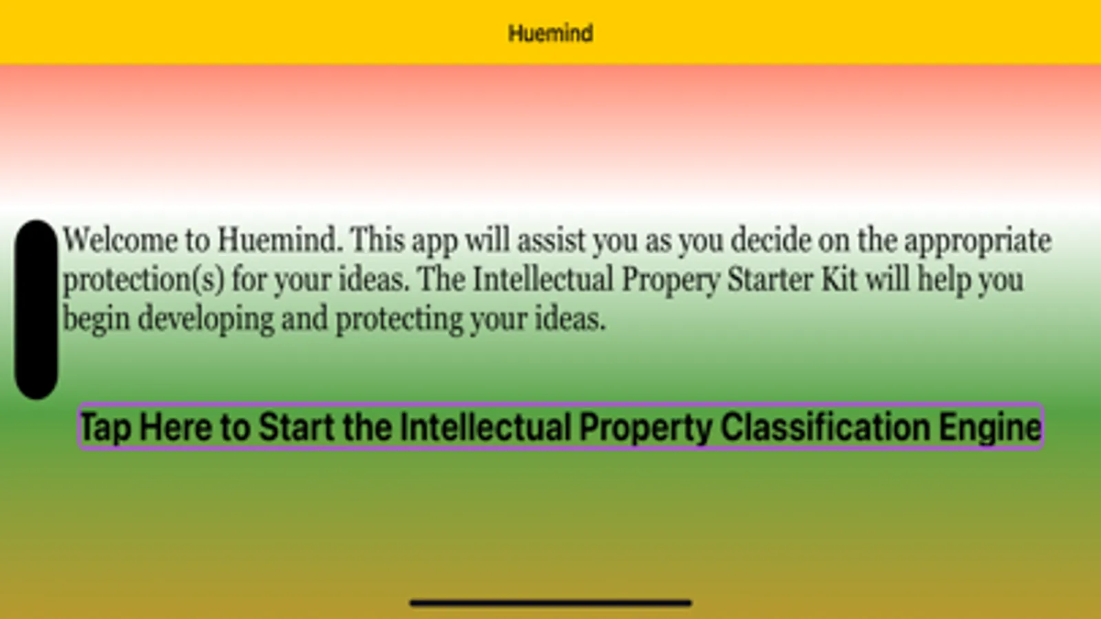 This interactive app uses the responses to queries to gain general information about the user's idea. It recommends the form(s) of protection that best suits the idea. Each question offers a choice of answers from which the user selects the most appropriate one for their concept. HueMind provides a detailed explanation of each question to ensure the user has ample information to choose the best answer to the query. After the questions, the app displays the best protection(s) for their idea to the user. Each display of protection also comes with a comprehensive explanation of the type of protection(s) for the idea. It provides the form(s) of protection that best suits the idea.