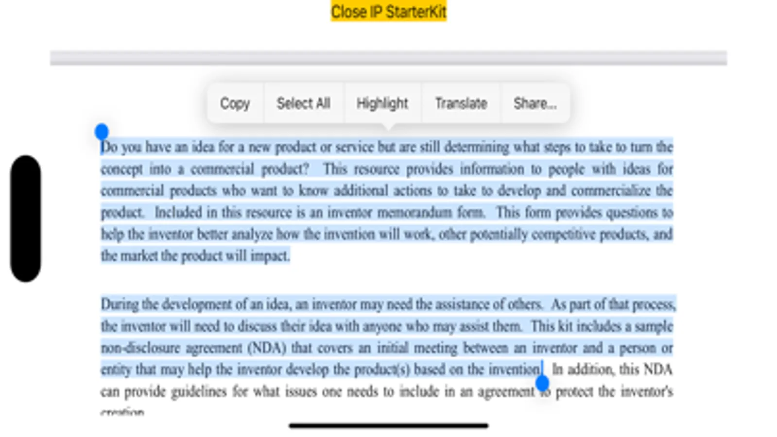 This app does not ask for specific information about a user's idea. There is no fear of users exposing information about their ideas by using this app. An objective of this app is to provide the user with an initial base of information regarding how to develop and protect an idea. HueMind and its contents give the user the knowledge and confidence to step out and pursue their dreams, turning their ideas into products and services that can benefit society. Other resources are also available to assist users as they journey from idea conception to commercialization.