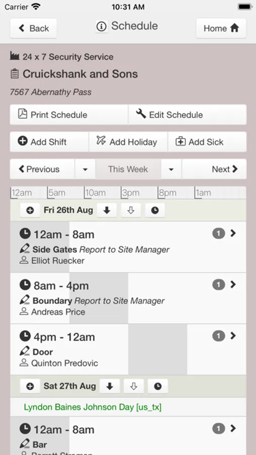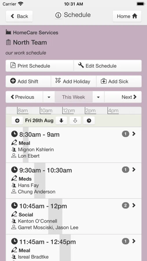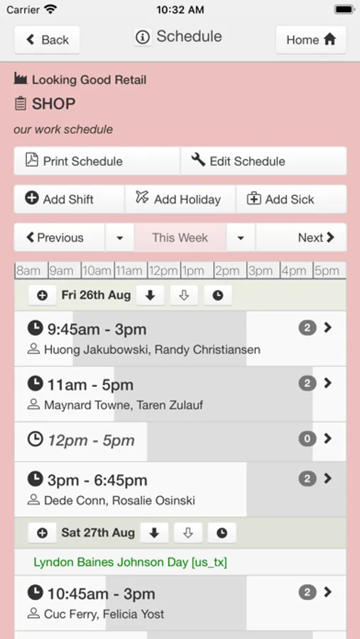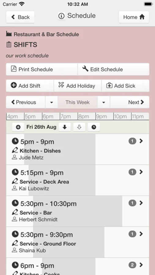 Our intuitive drag 'n' drop real-time web app makes scheduling a breeze for managers. Easily schedule staff and shifts, add holidays and sick leave, and set shifts to repeat automatically. Plus, our online system puts the schedule at your fingertips, allowing all staff members to access it from any computer or device.