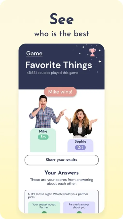 Comparison feature enables you to discover what your partner thinks about you. Just choose a topic and learn more about your partner in a fun way & don't forget to be honest