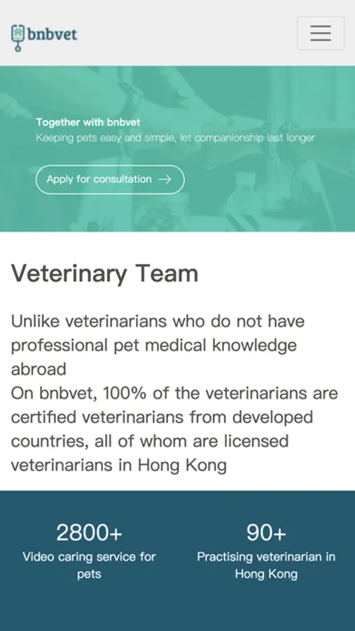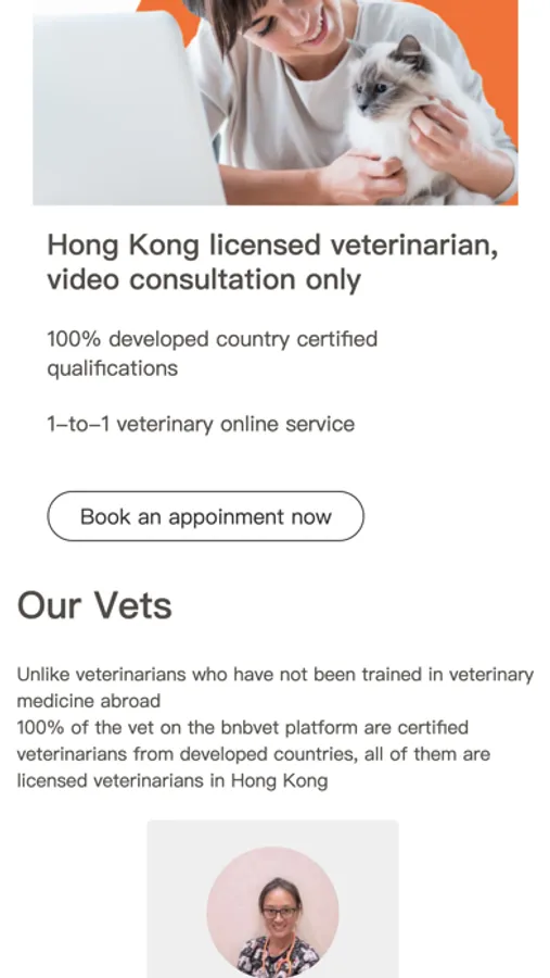 BnBVet是一個線上獸醫平台,平台上的獸醫100%為發達國家認證學歷,均為香港執業獸醫,平台提供遠程24小時咨詢服務,可以讓你安在家中即可與專業獸醫進行1對1在線諮詢,即使深夜寵物出現問題,身在其他國家的香港獸醫,都可以給予你視頻幫助,為需要快速緊急支援的寵物主人,提供即時的專業建議。