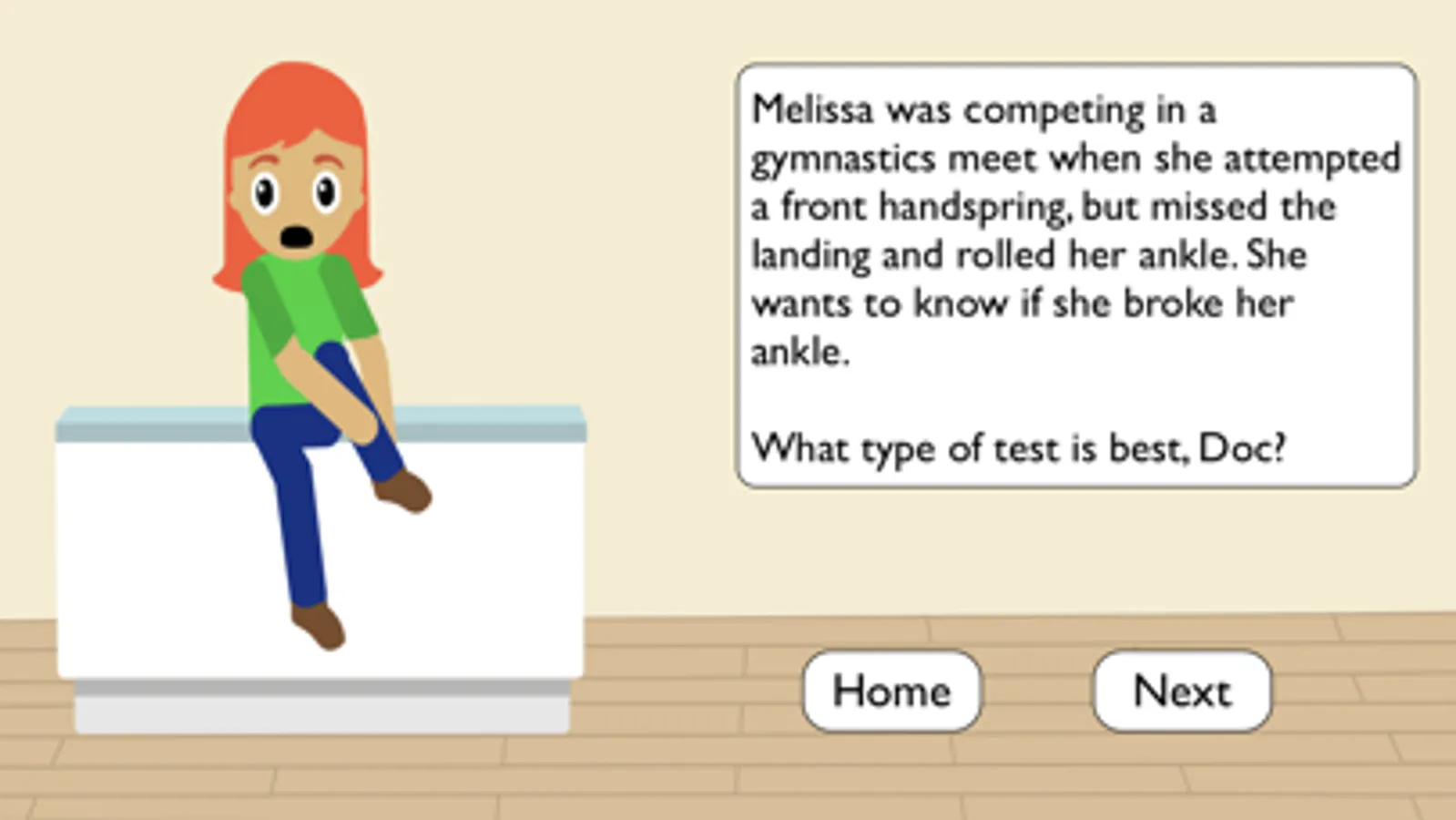 Patients are coming to you after competing in various sporting events where they got hurt. You have to order the correct test, diagnose the injury, and advise a treatment plan. If you need a refresher on anatomy or how to read scans, a textbook is provided!