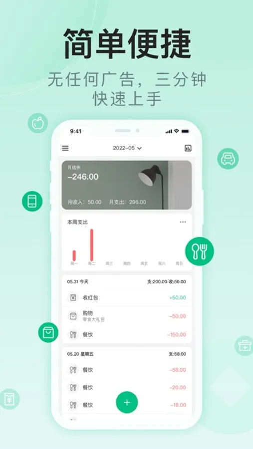 快速记录收支,自动生成图表,记账快捷又专业,多维度账单解读,全面了解你的财务状况,帮你轻松管钱告别月光。