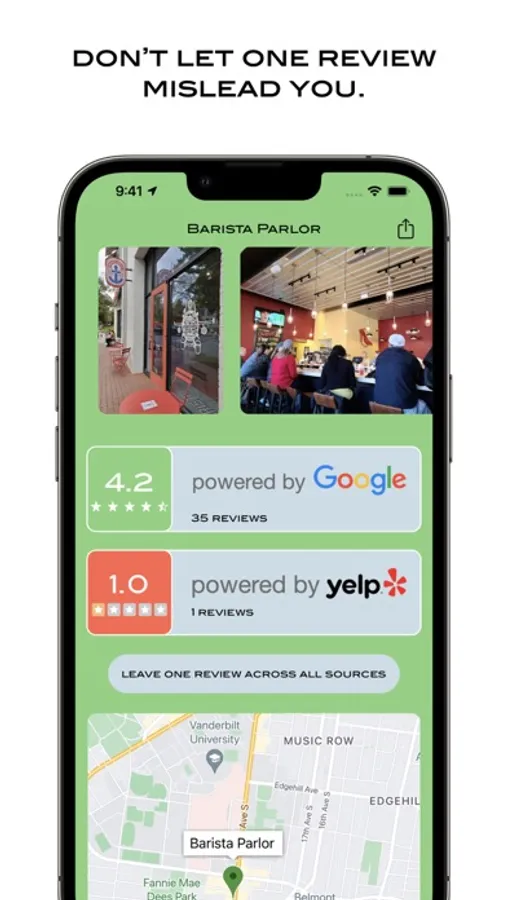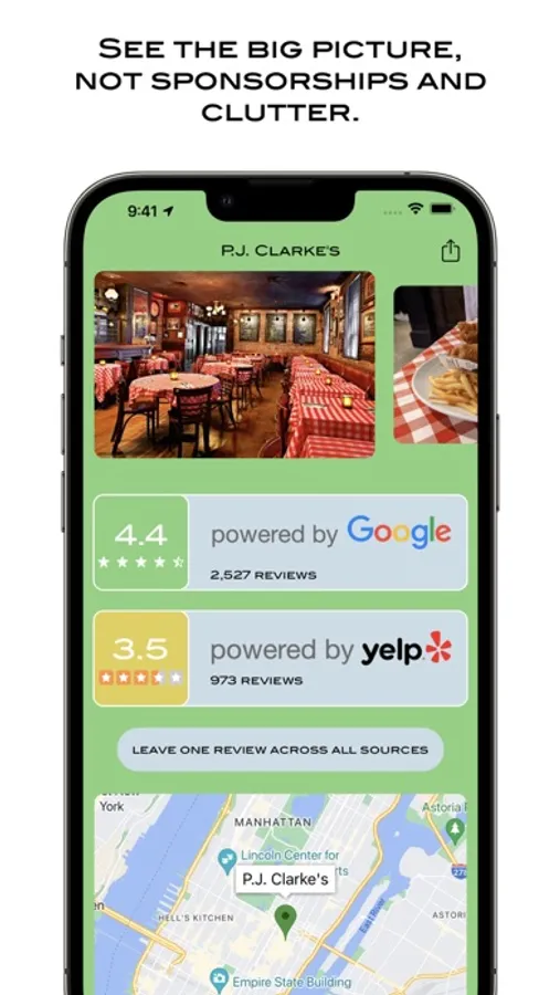 Want to verify the restaurant that your friend recommended for dinner is actually as incredible as they say? Clear, easy-to-read review results do just that. Review Hub removes the clutter of sponsored results and ads, and each review counts equally, regardless of the site the review is posted on. Just search for the name and location, and if it's in The Green Club, you're good to go.