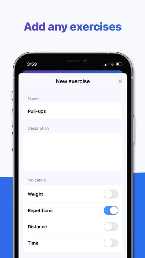 ⁃ Creating exercises. There are 4 types of results available for exercises: weight, repetitions, distance, time.