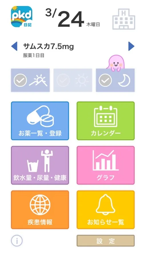 PKD(多発性のう胞腎)患者さんの飲水量・尿量・腎機能・健康情報などを簡単に記録し、治療経過の推移を把握していただくために開発されたアプリです。