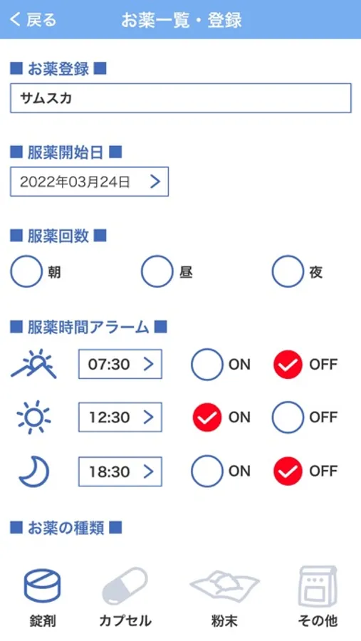 服用中のお薬と服薬時間を登録し、アラーム通知により飲み忘れを防ぎましょう。