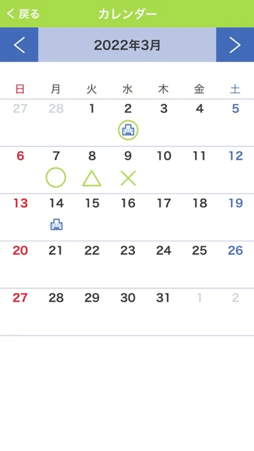 カレンダー上のアイコンから、通院日と服薬履歴を一目で把握できます。