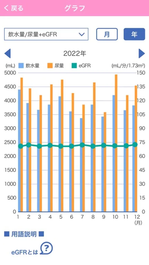 ■記録した各項目(飲水量、尿量、腎機能、健康情報)の推移を期間(日・週・月)別にグラフ化