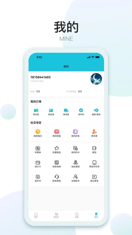 “我的”,主要是用户自己设置的,包括昵称、头像等资料。查看购物订单,优惠券,收获地址及自己收藏的服饰用品及箱包