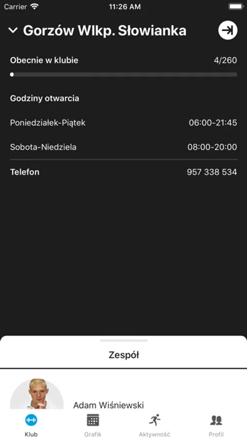 -Uzyskać informacje o klubie, takie jak godziny otwarcia, lokalizacja, grafik zajęć fitness itp.,
