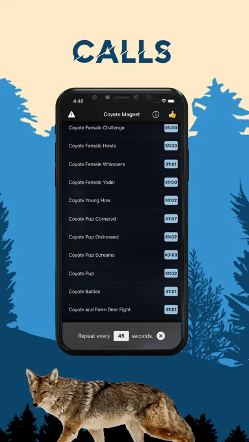 You can play the sounds individually and set them to repeat after the amount of seconds that you desire. Or you can manually tap different predator hunting calls to create a deadly combination of calls that will work perfectly for the coyotes you are hunting.