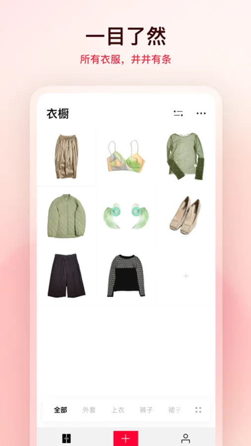 为此我们匠心打造了这款精美的衣橱管理工具,「透明衣橱」展示清晰美观、查找快捷高效、添加极速智能,助你随时随地进行衣橱整理和搭配构思,衣服再多都能一手掌控。