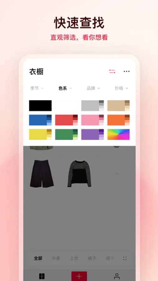 简洁清晰的季节、色系、品牌、价格筛选,按你所需,轻松找到对应衣服。