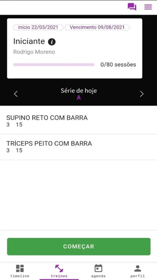 - Acesse seus TREINOS: informações sobre os exercícios, cargas, repetições, dicas de execução e vencimento do treino. Consulte também sua avaliação física sempre que quiser.