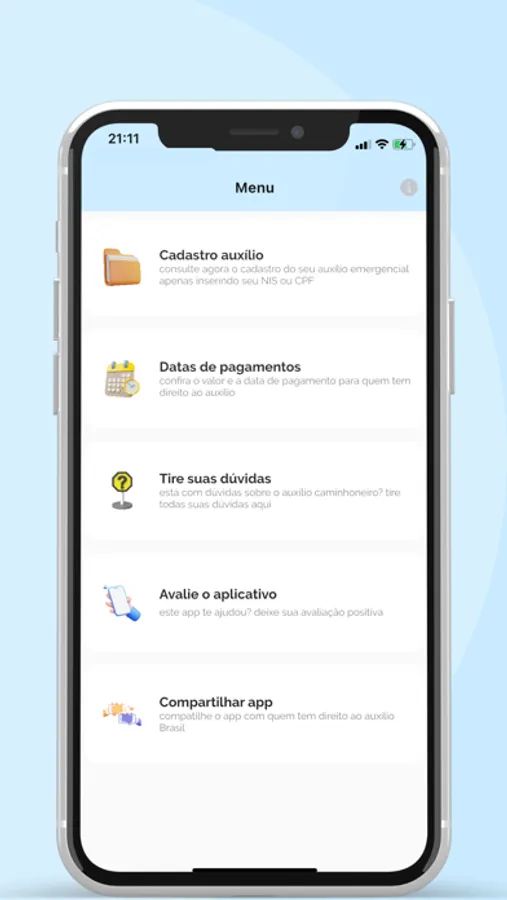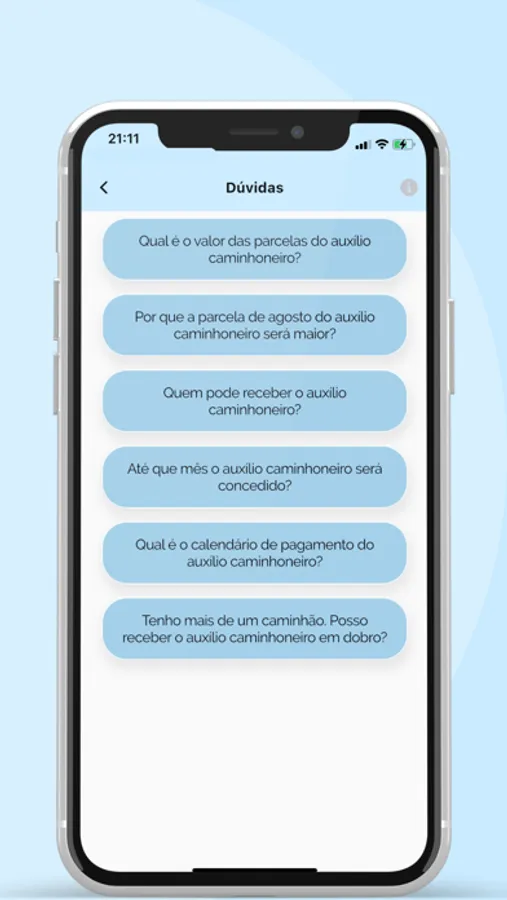No aplicativo você encontrará informações essenciais sobre o auxílio caminhoneiro, como consulta de cadastro, datas de pagamentos, dúvidas sobre o benefício, tudo de forma dinâmica e sem complicações